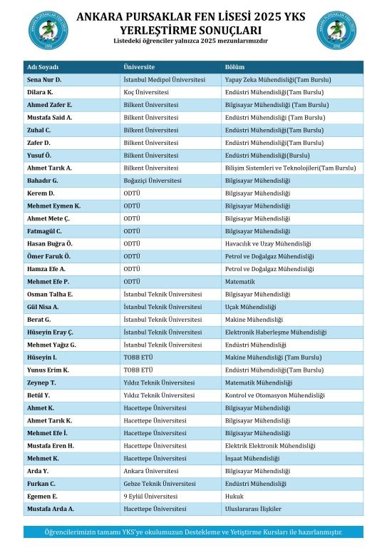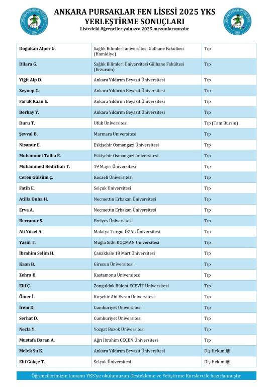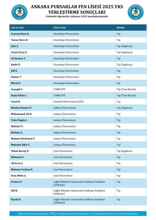 2025 YKS sonuçlarına göre üniversiteye yerleşen öğrencilerimizi tebrik ediyoruz. Öğrencilerimizin tamamı YKS'ye okulumuzun "Destekleme ve Yetiştirme Kursları" ile hazırlanmıştır.